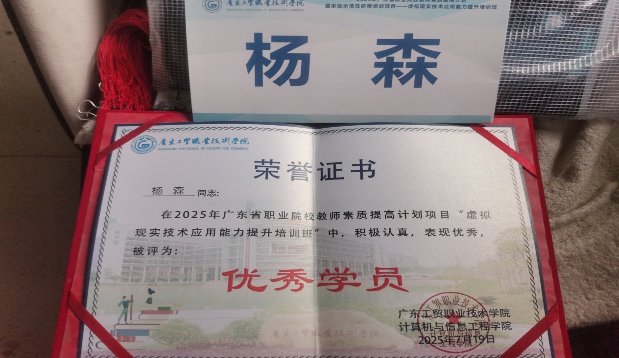 2025 年 7 月 12日至7月 19日,我院数字媒体技术专业专任教师杨森参加了广东省职业院校教师素质提高计划国家级示范性培训——虚拟现实技术应用能力提升培训班,此次国培由广东工贸职业技术学院计算机与信息工程学院举办。来自全省24所高职院校的共30名教师顺利完成培训,标志着广东省在推动职业教育与虚拟现实技术深度融合方面迈出坚实一步。