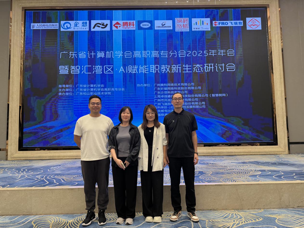 2025年11月7日至9日,广东省计算机学会高职高专分会2025年年会暨“智汇湾区·AI赋能职教新生态”研讨会在韶关希尔顿欢朋酒店隆重举行。我校人工智能技术学院副院长尹旭熙、人工智能技术应用教研室主任赖伟科、大数据技术专业负责人杨利杰及党政办公室主任肖健南代表学校参会。