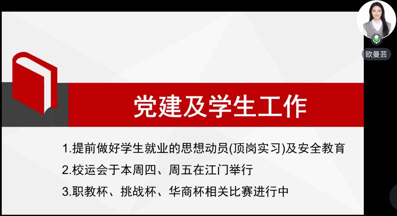 最后,欧曼芸副院长就党建及学生工作作出指导。她指出,一要提前做好学生就业思想动员与顶岗实习期间的安全教育;二要组织好本周五、周六在江门校区举行的校运会,展现学院学子风采;三要积极推动“职教杯”“挑战杯”“华商杯”等赛事的备赛工作,以赛促学、以赛促教。