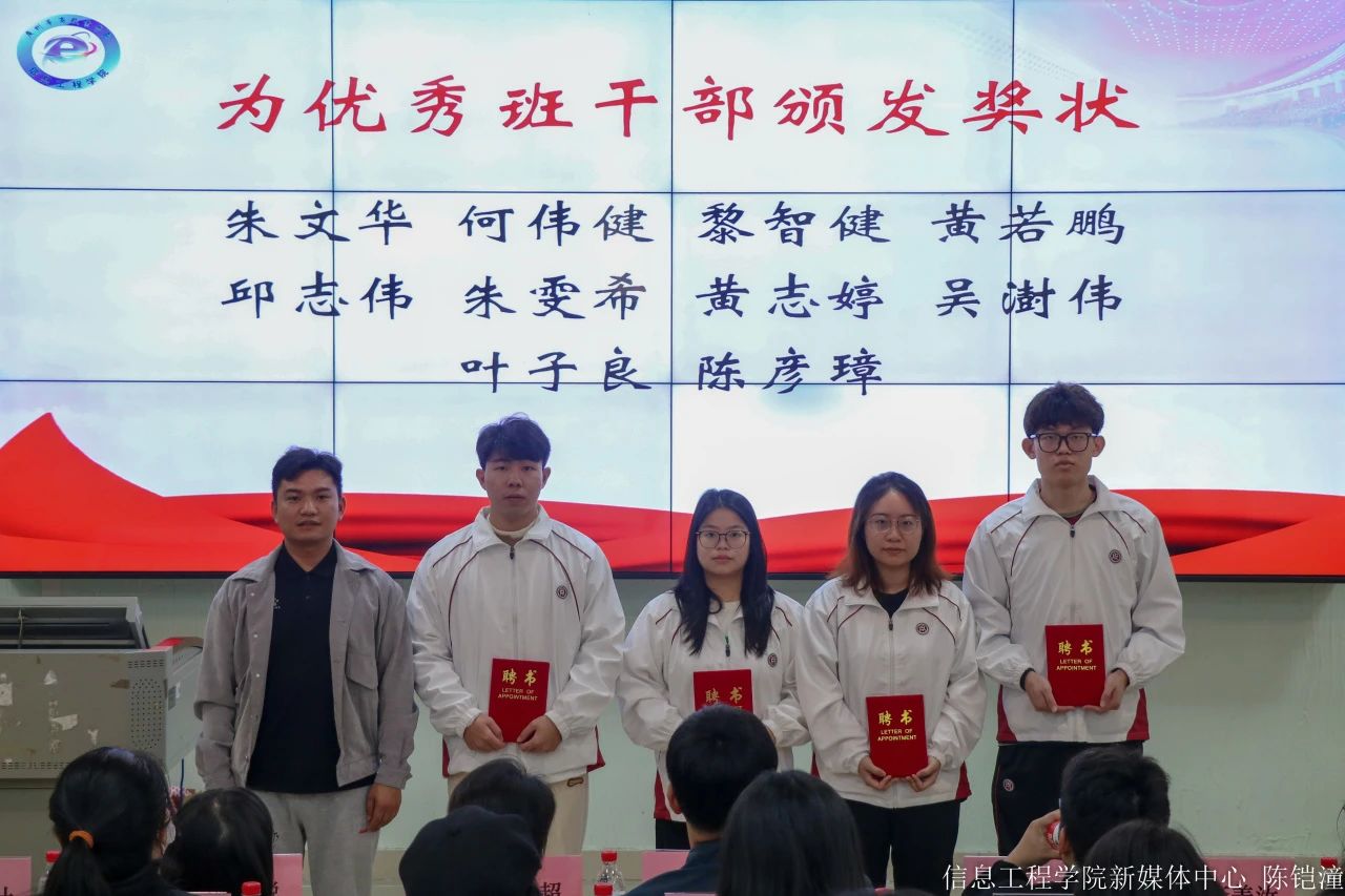 参与本次表彰大会的领导有:信息工程学院院长龚芳海、副院长王超、学生第一党支部书记叶锐、学生第二党支部书记方毓聪、团委副书记吴欣瑶、21级辅导员李美汝、赖勇计、22级辅导员徐柳敬、李影、生沙沙、23级辅导员马正娟、郭晓丽、邹君、刘文丽。