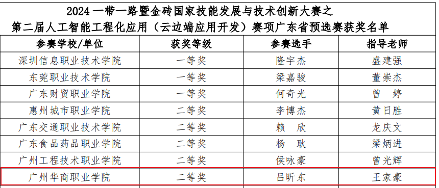 我校师生团队在刚结束的2024年金砖国家职业技能大赛人工智能工程化应用(云边端应用开发)广东省选拔赛上表现卓越,荣获二等奖,成功晋级国赛。这是华商职院在人工智能领域技能竞赛中的又一次重大突破,充分展示了我校在智能技术人才培养方面的实力。