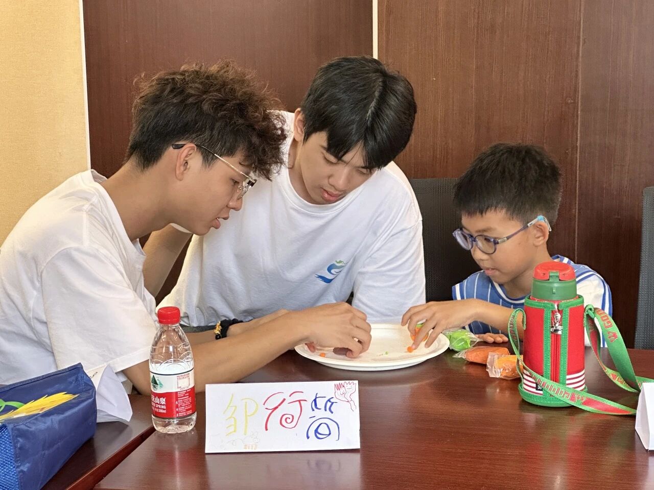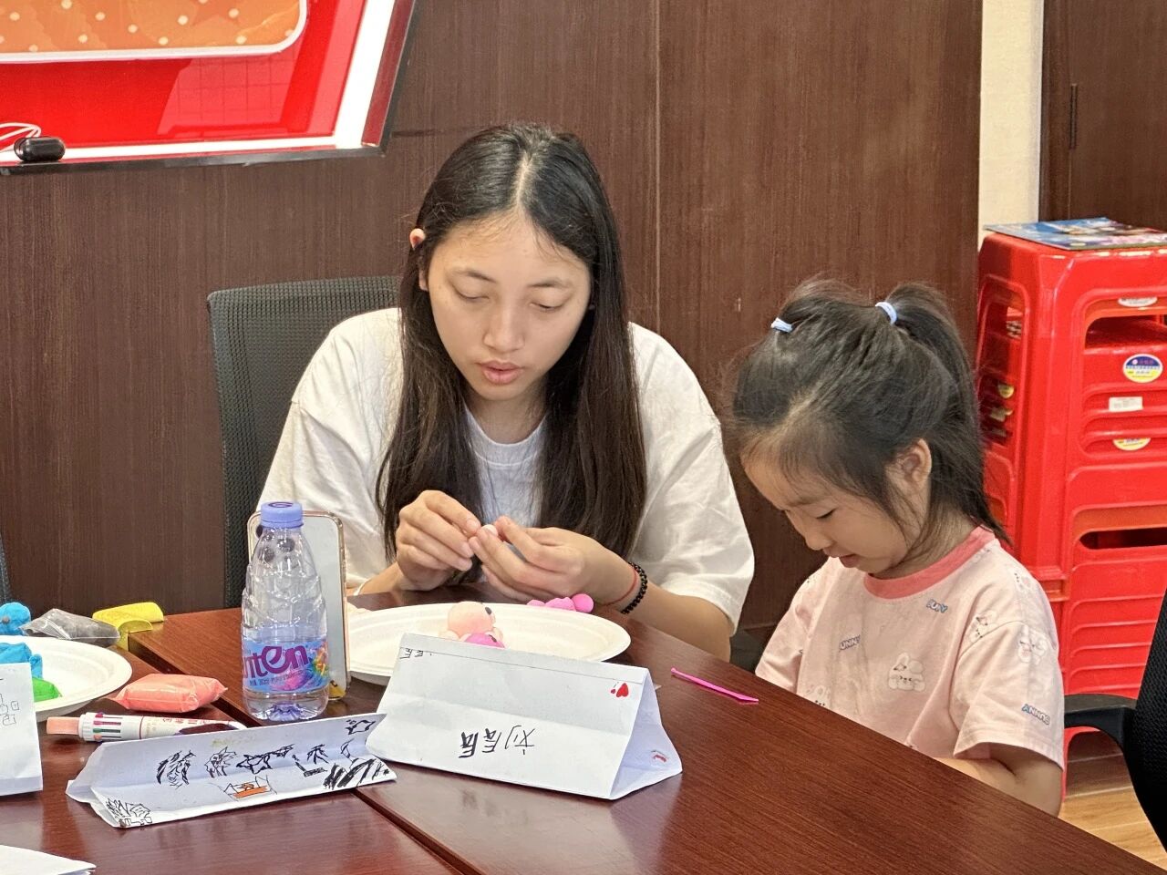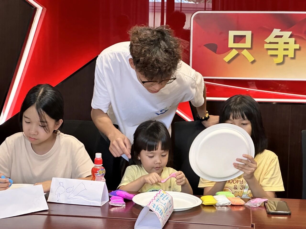 走进 DIY 粘土活动区域,仿佛踏入了一个五彩斑斓的创意世界。实践队队员们先向孩子们介绍超轻黏土的特性、使用技巧以及安全注意事项,随后实践队队员们为孩子们分配粘土和工具。