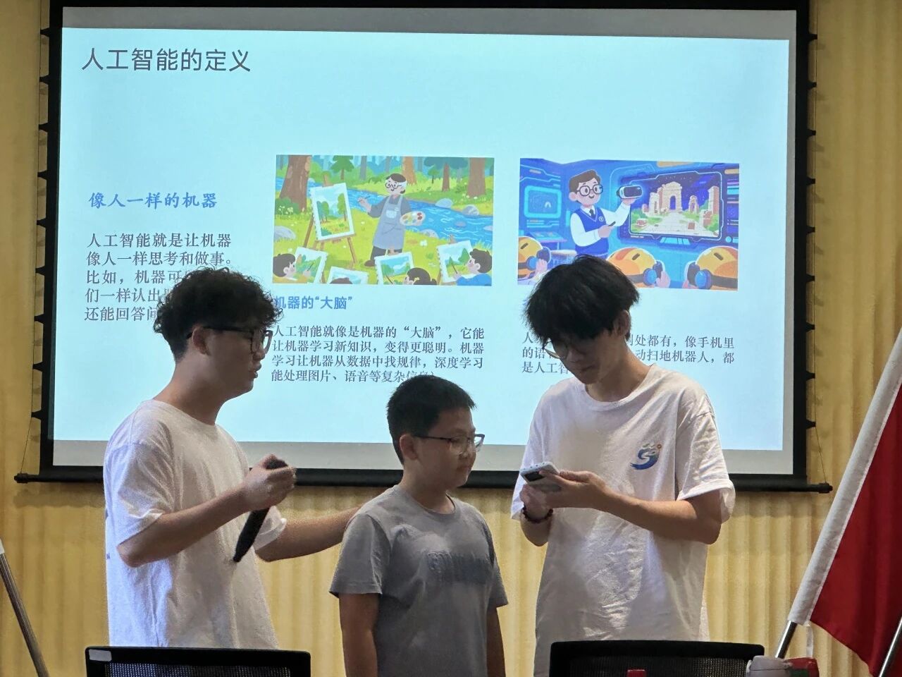 在 “小小科学家” 活动现场,实践队队员马延标摇身一变,成了人工智能知识的传播使者。他用趣味讲解与互动,点燃孩子们对这一新兴领域的好奇之火。先从生活里随处可见的人工智能应用入手,用生动的话语介绍什么是人工智能。“大家每天都用的语音助手,像手机里的 Siri、小爱同学,它们能听懂咱们说话,还能回答问题,这背后就是人工智能在发挥作用。” 他一边说着,一边现场演示,孩子们的目光一下子就被吸引过来,满是好奇。