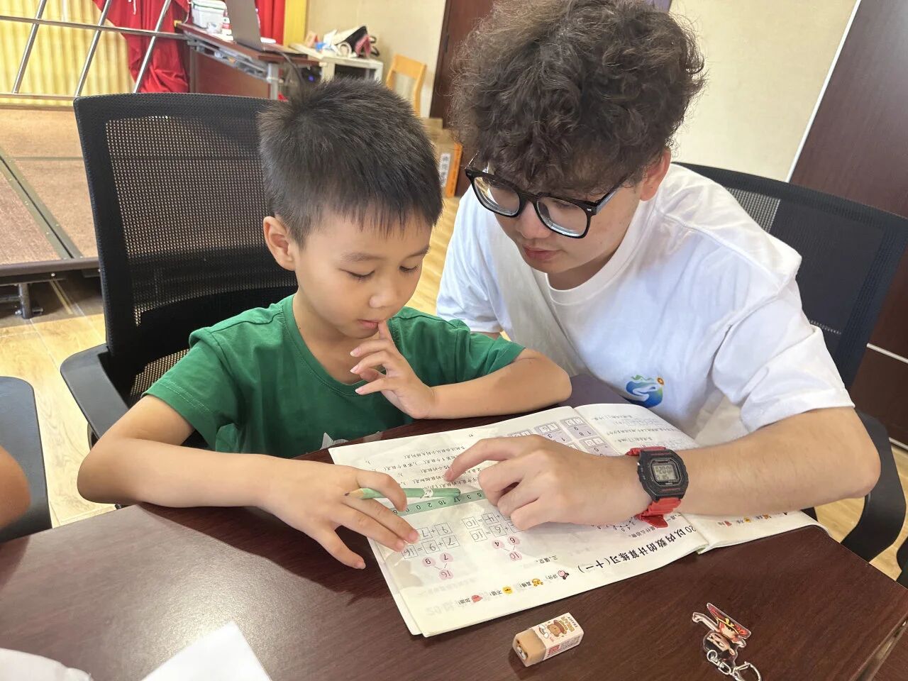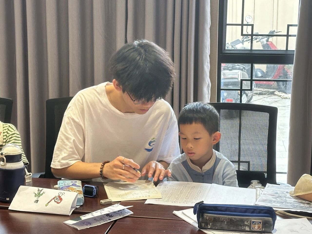 “作业精灵魔法屋” 内,实践队队员们化身耐心的学习引路人。孩子们捧着作业本围过来,队员们逐本细致检查,圈出写错的字词、算错的算式,手把手教他们订正。遇到共性错误,还会集中讲解,比如讲相似三角形时,队员们拿出不同大小的三角尺,对比着说:“你看这两个三角形,形状一样、角相等,就是大小不同,这就是相似三角形。”