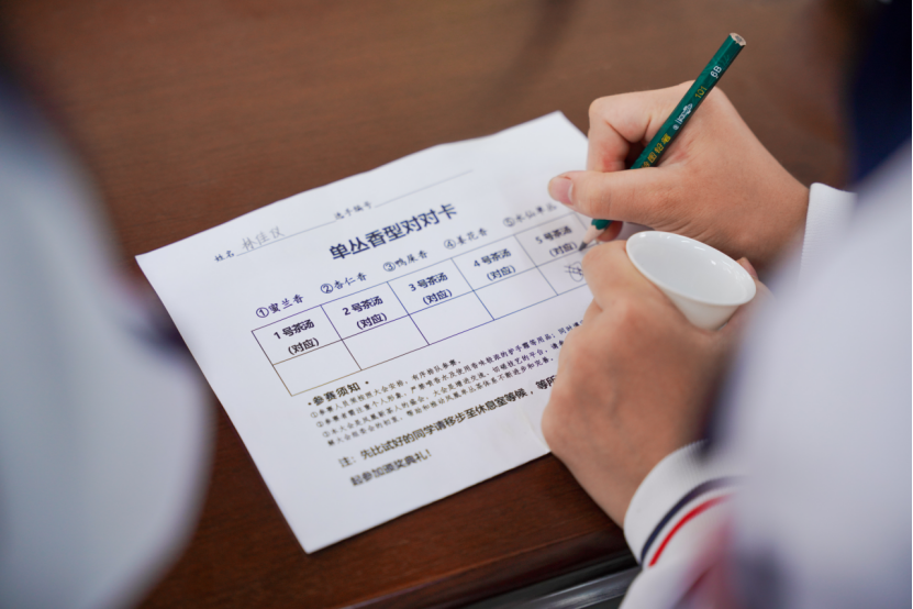 01初赛:茶汤对茶样盲品识香,见真章! “茶汤对茶样”环节率先考验“真功夫”。同学们面对3-5款不同香型的凤凰单丛茶(如蜜兰香、鸭屎香、杏仁香等)盲品茶汤,需要调动刚刚学到的知识,在“单丛香型对对卡”上填写答案。这不仅比拼味觉与嗅觉的敏锐度,更考验对香型特征的记忆与描述能力。同学们或凝神细品,或蹙眉思索,或自信挥笔,现场气氛紧张又热烈。