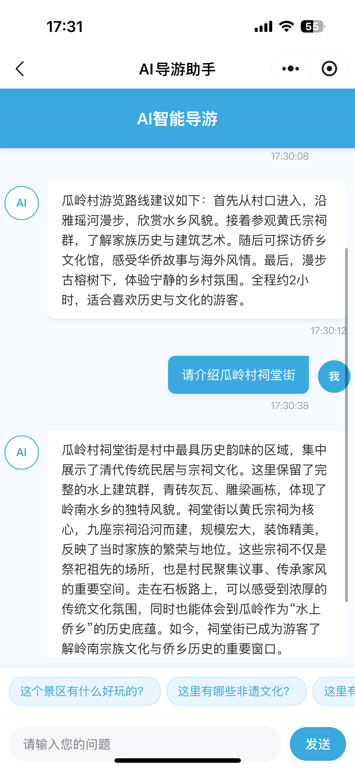 小程序融入大语言模型,团队建立瓜岭古村本地的结构化知识库,打造瓜岭文化相关的专属AI模块。这份知识库详尽收录了各景点的背景资料,从宁远楼的建筑特色到祠堂街的民俗传承,从金丝楠木艺术馆的藏品故事到精品民宿的人文设计,皆有细致记载。