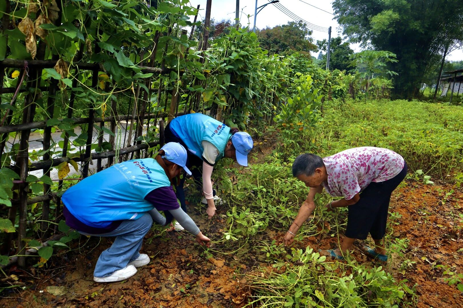为了更深刻地体悟乡土的价值,理解农民的艰辛与土地的厚重,队员们主动投身到割水稻、拔花生、摘黄皮果等农耕劳作中。夏日的阳光炽热而强烈,晒在肩头烫得人皮肤发疼,可队员们没有丝毫退缩。他们手握镰刀走进金黄稻田,学着农民伯伯的样子弯腰挥镰,将沉甸甸的稻穗收割下来;蹲在田间拨开湿润泥土,小心拔出饱满的花生;穿梭在枝繁叶茂的黄皮果树下,细心采摘酸甜的果实。汗水顺着脸颊滑落,滴入泥土,每一滴汗水里都饱含着对土地的敬畏与对农耕的理解。在这个过程中,队员们真切触摸到了乡土的温度——那是土地孕育生命、滋养万物的厚重,是农民们一年到头辛勤耕耘的艰辛。每一次弯腰劳作、每一次伸手采摘,都让助农的情怀愈发深厚,也让青春的脉搏与乡土发展的节奏同频共振,真正明白乡村振兴之路,必须扎根土地、尊重农耕,才能走得坚实、走得长远。