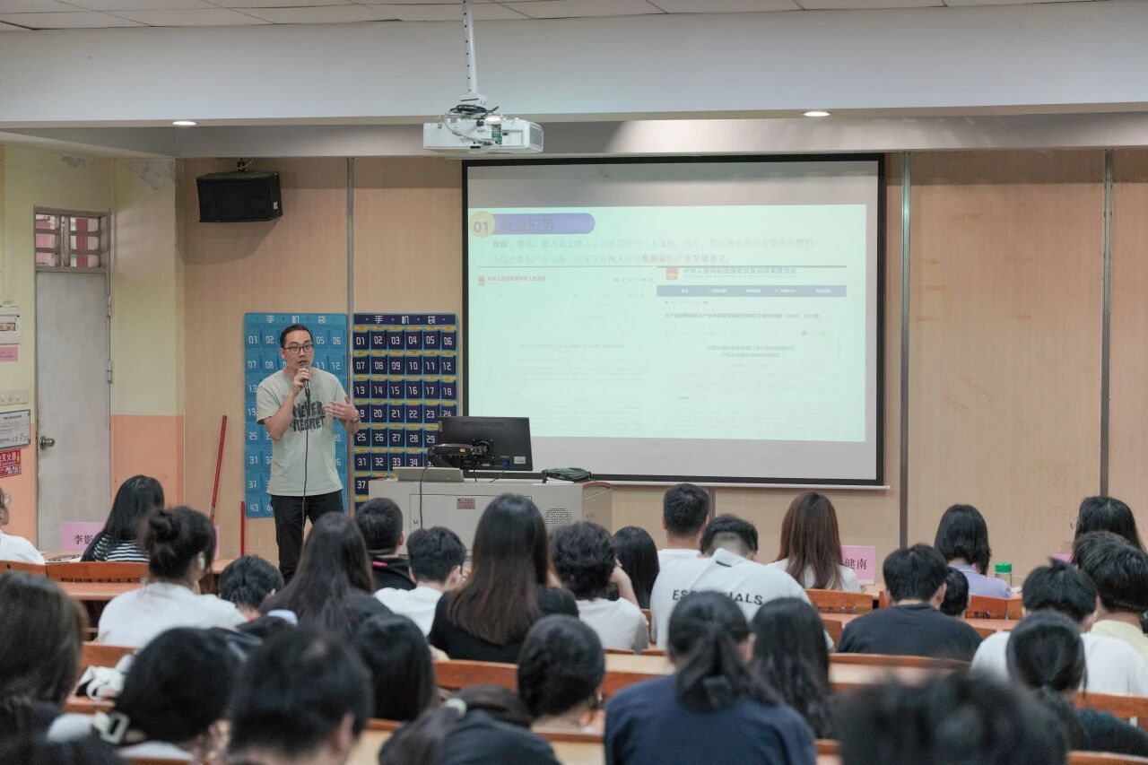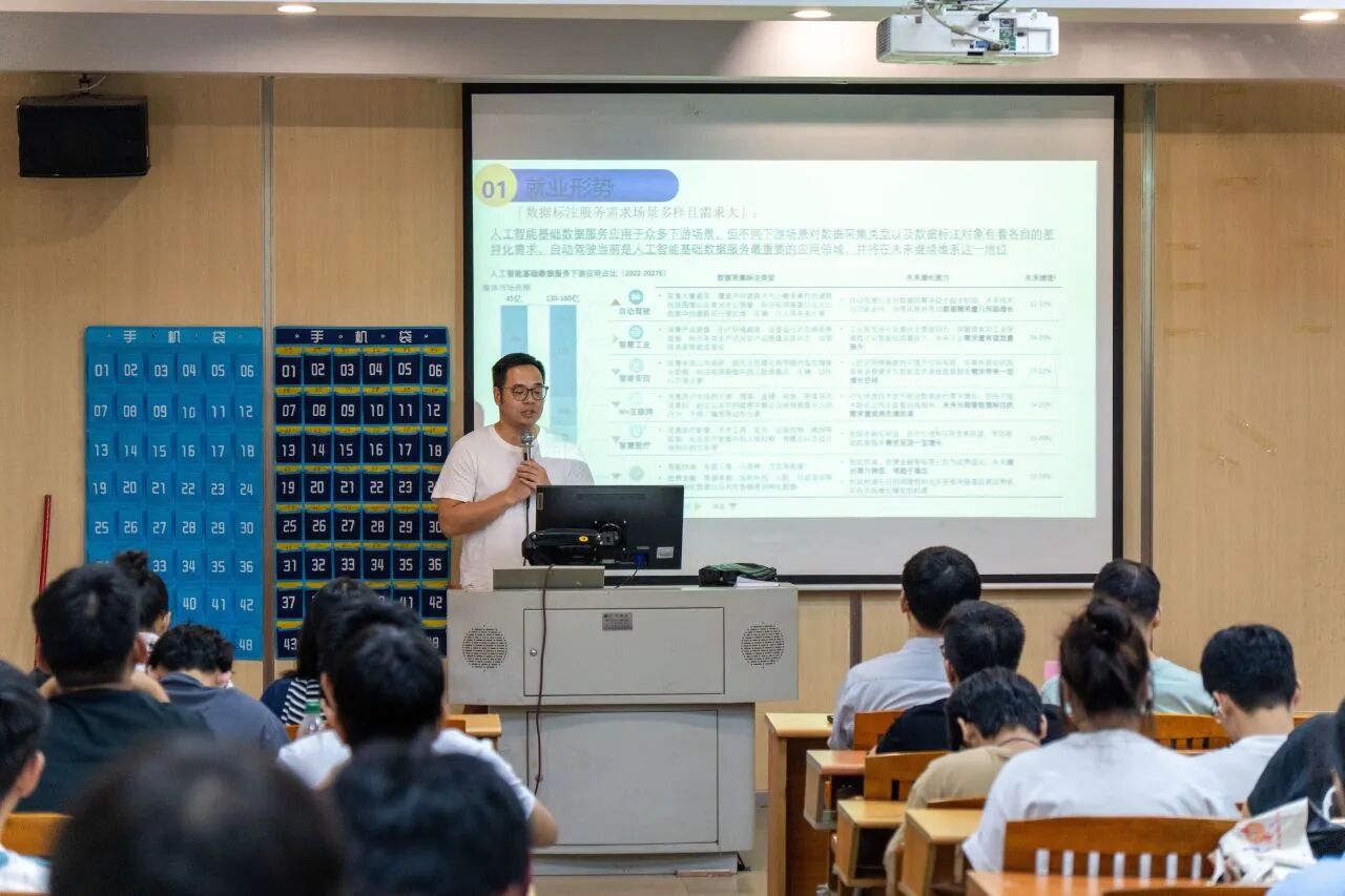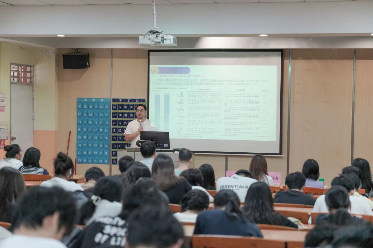 人工智能技术应用技术员赖伟科围绕技术应用层面,讲解了数据标注、数据清洗等岗位的核心技能要求,使同学们对岗位工作内容有了直观认知。同时他还针对学生关心的“岗位门槛”问题,给出清晰答案——入门阶段注重“细心+耐心”,但长期发展需要沉淀。