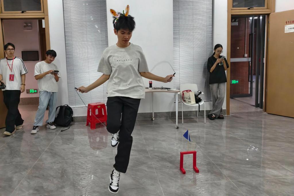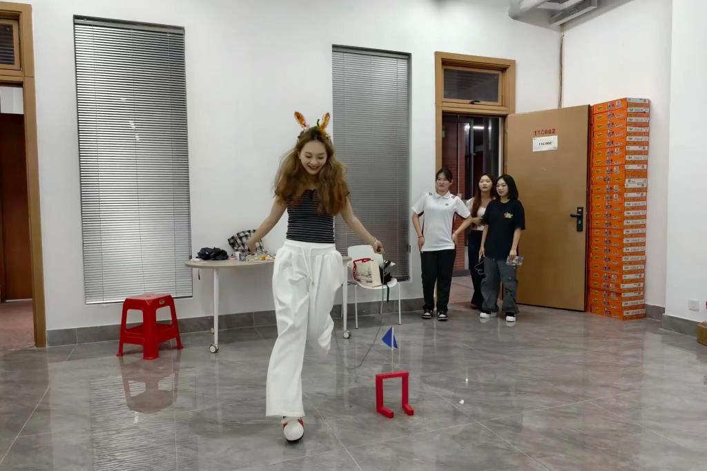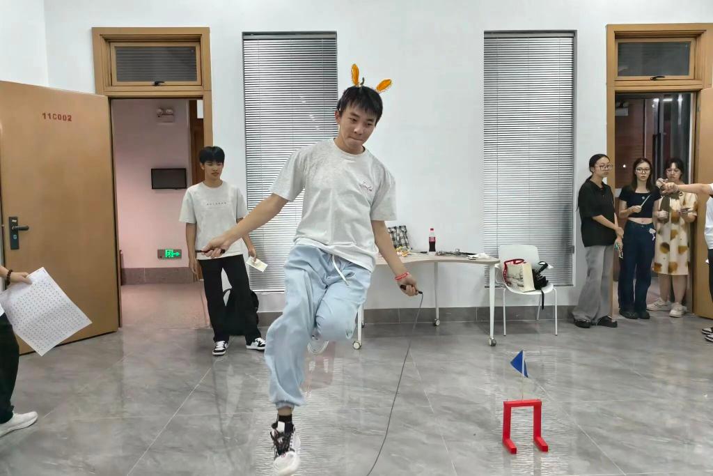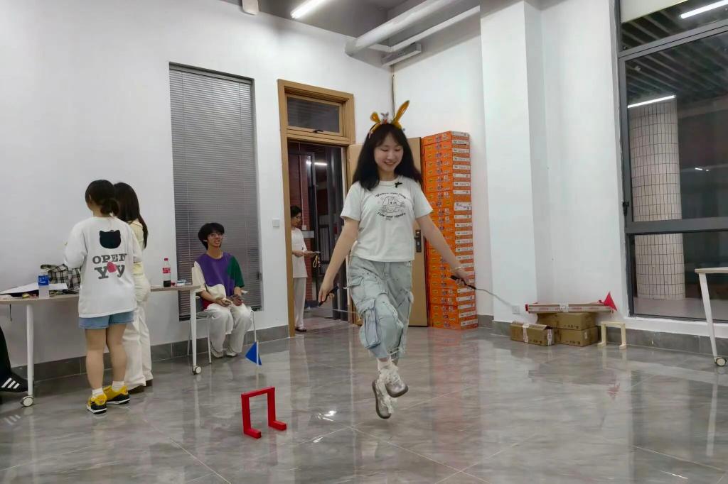 在启超书院的11c002室,进行了一场刺激与挑战的障碍物跳绳大赛,同学们化身为“月兔”来挑战完成这场大赛。在刺激中完成跳绳任务,既考验耐力与协调性,也带来别具一格的感官体验。营造出“兔跃中秋”的梦幻氛围,让同学们在运动中感受中秋的诗意与童趣。