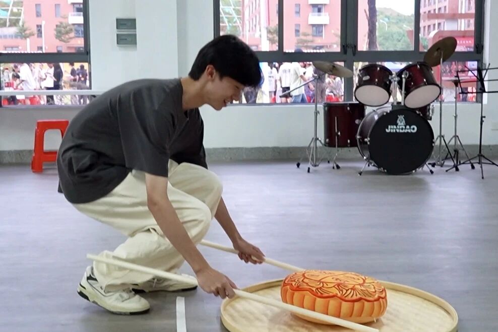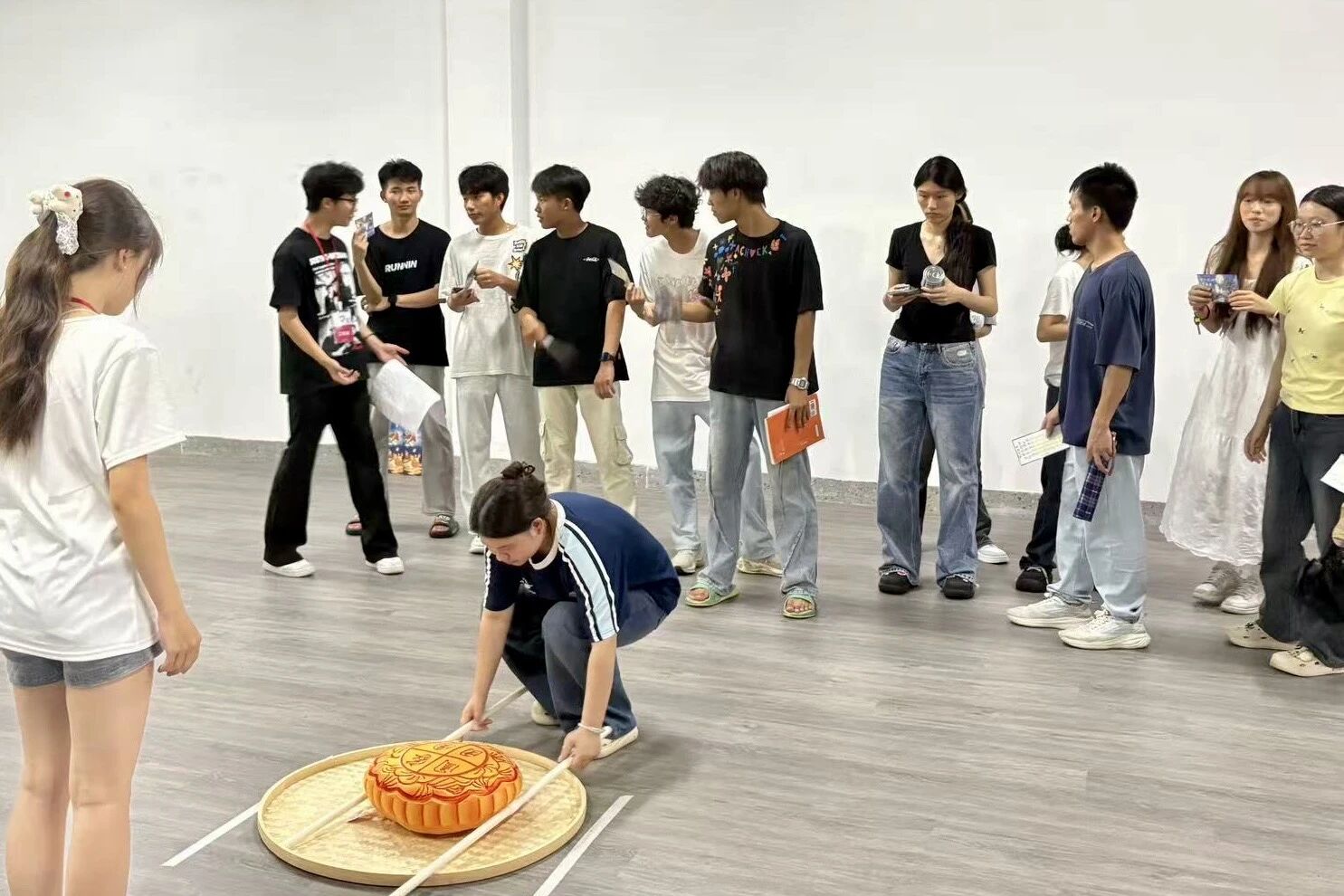 在启超书院11D003室进行夹月饼竞技活动,夹月饼场地上,参赛者需用筷子将月饼从起点夹至终点,充分考验个人的专注力与操作技巧。虽为个人竞技,但彼此间相互鼓励,加油助威,洋溢着和谐温馨的气氛。不仅让大家在轻松游戏中感受传统文化魅力,也放松了身心,增进了情感交流。