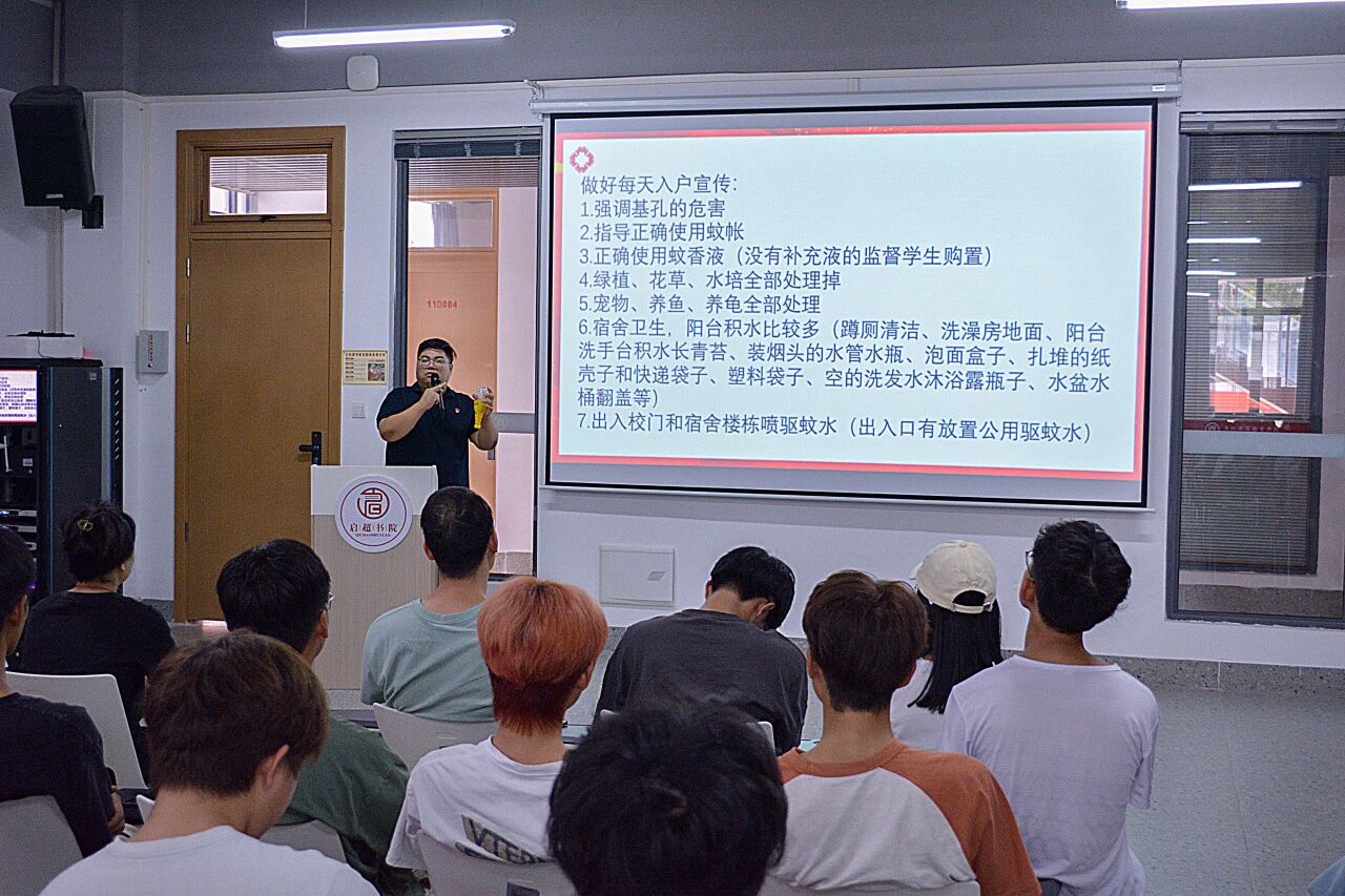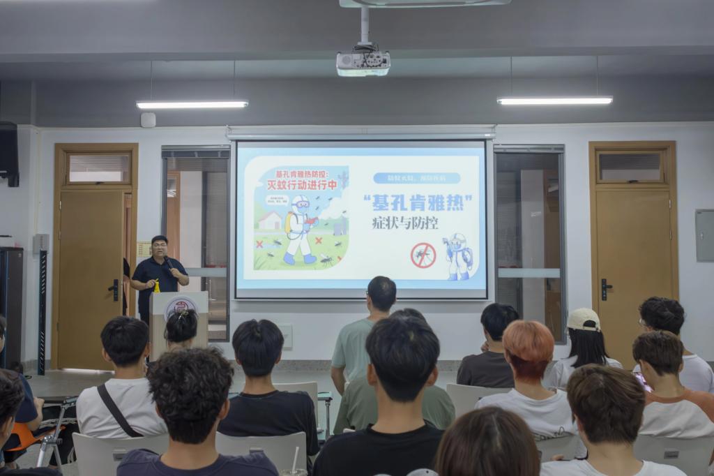 会议第一议程由陈浩华老师主讲。陈浩华老师从基孔肯雅热的疾病症状、传播方式及防控措施等方面进行了细致讲解,并多次强调本次疫情的严峻性与防控的重要性,提醒同学们提高防范意识,做好个人卫生与宿舍环境整治,共同筑牢防疫防线。